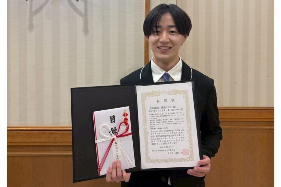 2025年室内環境学会学術大会@小倉にて、大会長奨励賞を受賞(酒井くん)by Bussei2025年12月3日2025年12月16日 酒井くんが2025年室内環境学会学術大会@小倉にて、大会長奨励賞を受賞しました。 受賞研究項目:廃漁網を例としたqNTAに基づく再生プラスチック原料に含まれる化学物質のリスクスクリーニング手法の検討 コメントを残す コメントをキャンセルメールアドレスが公開されることはありません。 ※ が付いている欄は必須項目です名前 ※ メール ※ サイト コメント ※ 次回のコメントで使用するためブラウザーに自分の名前、メールアドレス、サイトを保存する。 上に表示された文字を入力してください。 前の記事: 2025年室内環境学会学術大会@小倉にて、学生懇談会を主催(三原さん、池田さん) 一覧に戻る